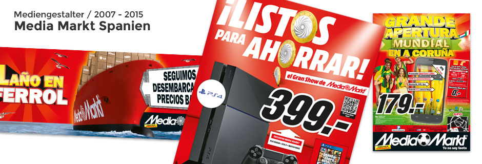 Bei der Redblue Marketing GmbH war ich vor allem mit dem Layout und der Reinzeichnung von Flyern, POS-Material und Außenwerbung aber auch Newslettern der Marken Media Markt und Saturn Spanien beschäftigt. Engen Kontakt zum Marketing knüpfte ich bei der Konzeption und Gestaltung von Kampagnen.